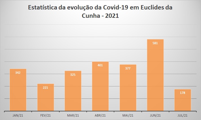 De acordo com a apuração realizada pela equipe de reportagem do site euclidesdacunha.com, em julho, o município de Euclides da Cunha registrou apenas 178 casos confirmados da doença chinesa, a menor quantidade do ano de 2021. Isso representa menos de um terço da quantidade de casos do mês anterior – que foi um dos piores momentos da pandemia. Quanto ao número de óbitos, foram registrados dois casos, sendo que o último aconteceu há mais de 20 dias. Em comparação com o mês anterior, a quantidade de mortes representa um quinto.