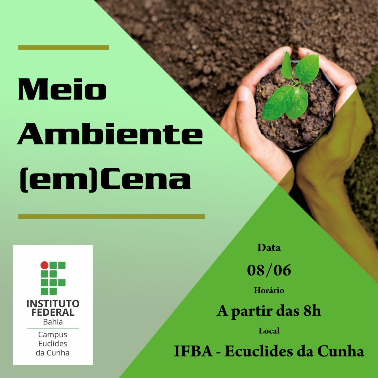 O Instituto Federal de Educação, Ciência e Tecnologia da Bahia – Campus Euclides da Cunha, com apoio da Pró-reitora de Extensão (PROEX), realiza no dia 08 de junho de 2022 o evento Meio Ambiente (em)Cena. A programação inclui atividade cultural, palestra, mesa-redonda, projeção de documentário e debates ligados às temáticas ambientais.
