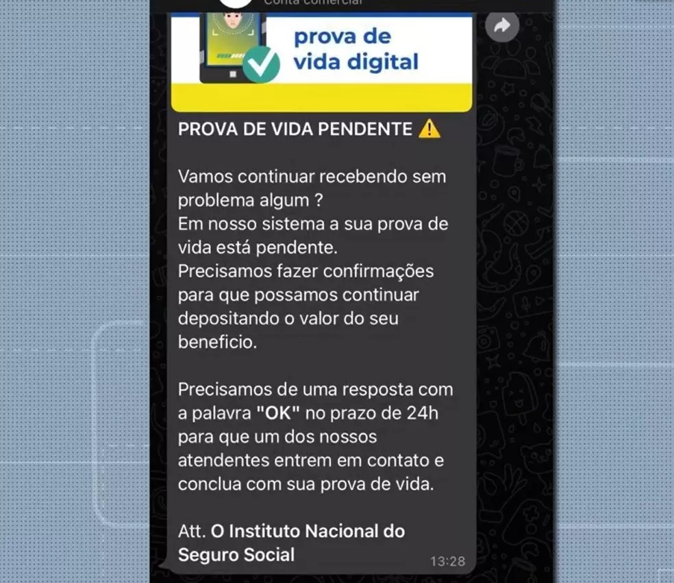 Em algumas situações, os criminosos enviam links para que o segurado faça o reconhecimento da biometria facial. O alerta é que, em caso de recebimento de ligações suspeitas, o cidadão desligue o telefone e não forneça nenhum tipo de informação. Se a abordagem for por mensagem, via SMS ou WhatsApp, o número deve ser imediatamente bloqueado.