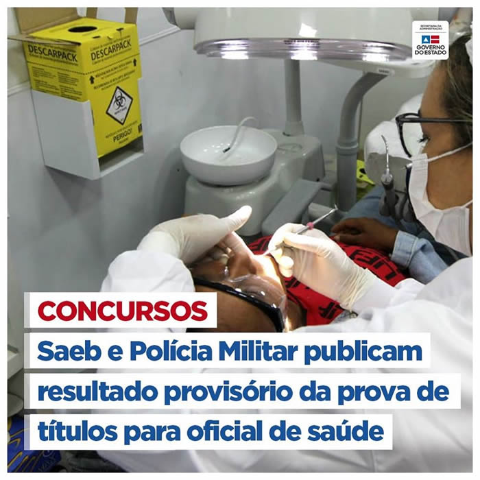 O Governo da Bahia publica nesta terça-feira (28), no Diário Oficial do Estado (DOE), resultado provisório da prova de títulos para o concurso de oficiais de saúde da Polícia Militar da Bahia (PMBA). Lançado pela Secretaria da Administração (Saeb) e PMBA em 2019, o certame teve suas provas aplicadas no dia 26 de janeiro deste ano e tem validade de um ano, podendo ser prorrogado, uma única vez, por igual período.