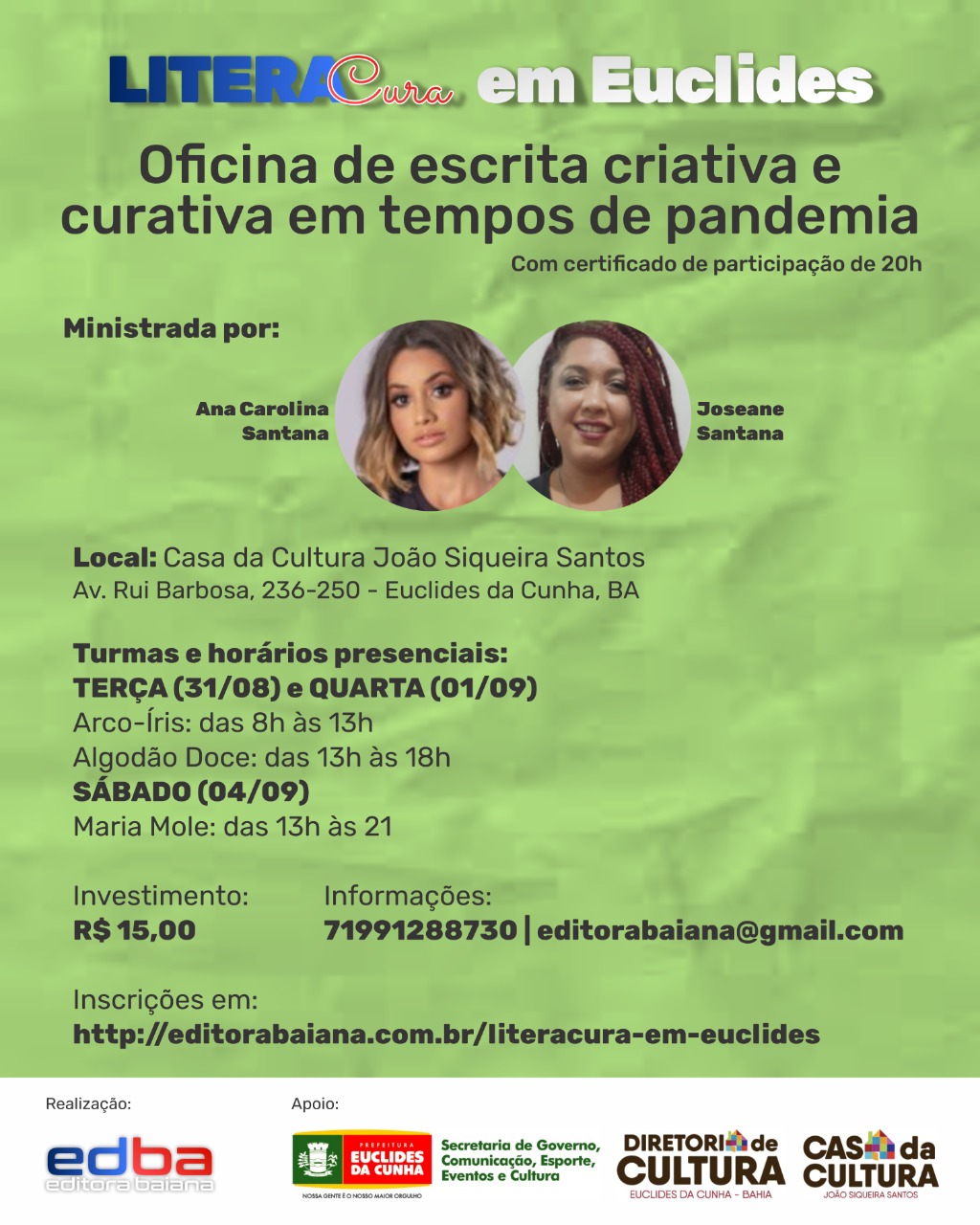 Em Euclides da Cunha, a Editora Baiana, terá o apoio da Secretaria Municipal de Governo, Comunicação, Esporte Evento e Cultura e da Diretoria de Cultura. A “LiteraCura em Euclides – Oficina de Escrita Criativa e Curativa em tempos de pandemia” será realizada na Casa da Cultura João Siqueira Santos, localizada na Av. Rui Barbosa, 236-250 – Euclides da Cunha, BA, com a seguinte programação: