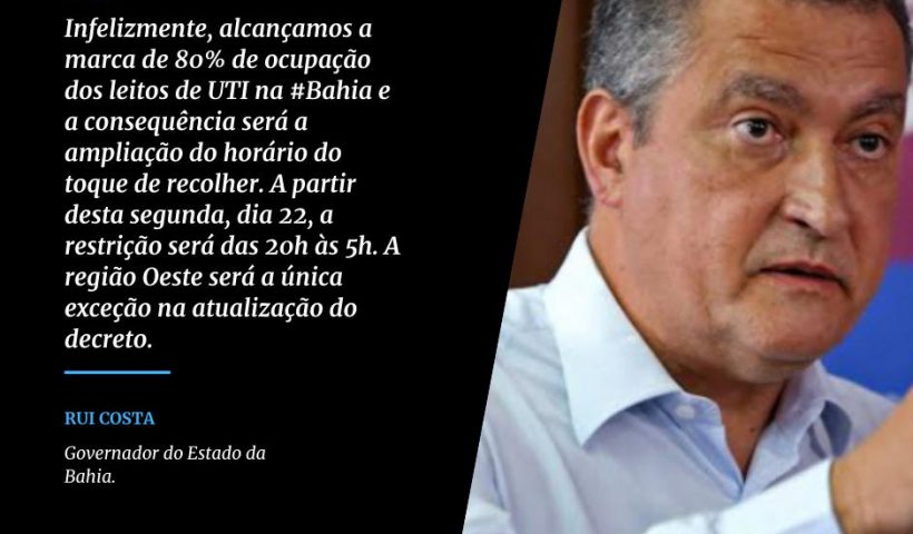 Ver mais Rui Costa recua o horário de movimentação comercial na BahiaPelo segundo dia consecutivo, Bahia registra maior número de pacientes em UTIs Covid-19